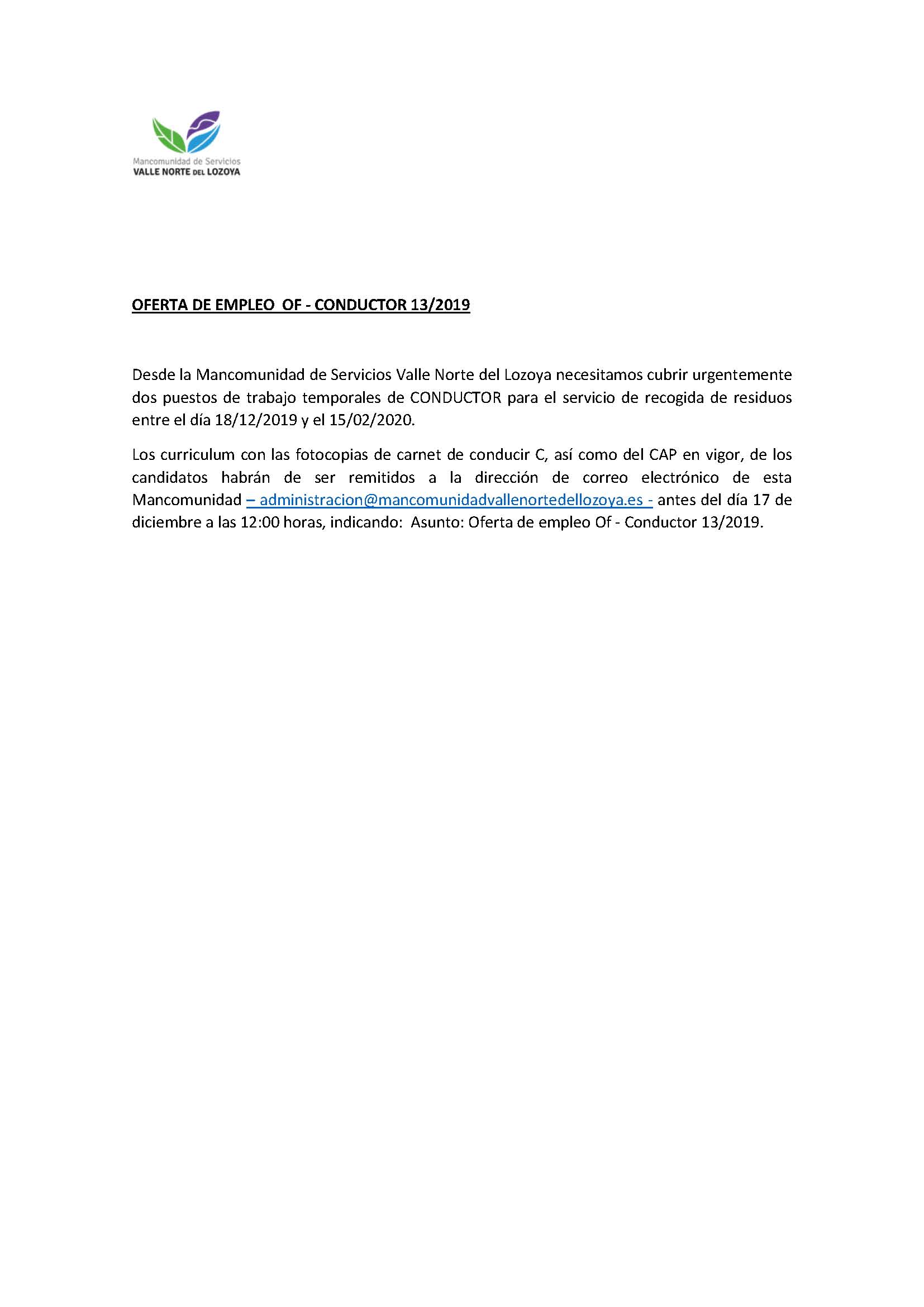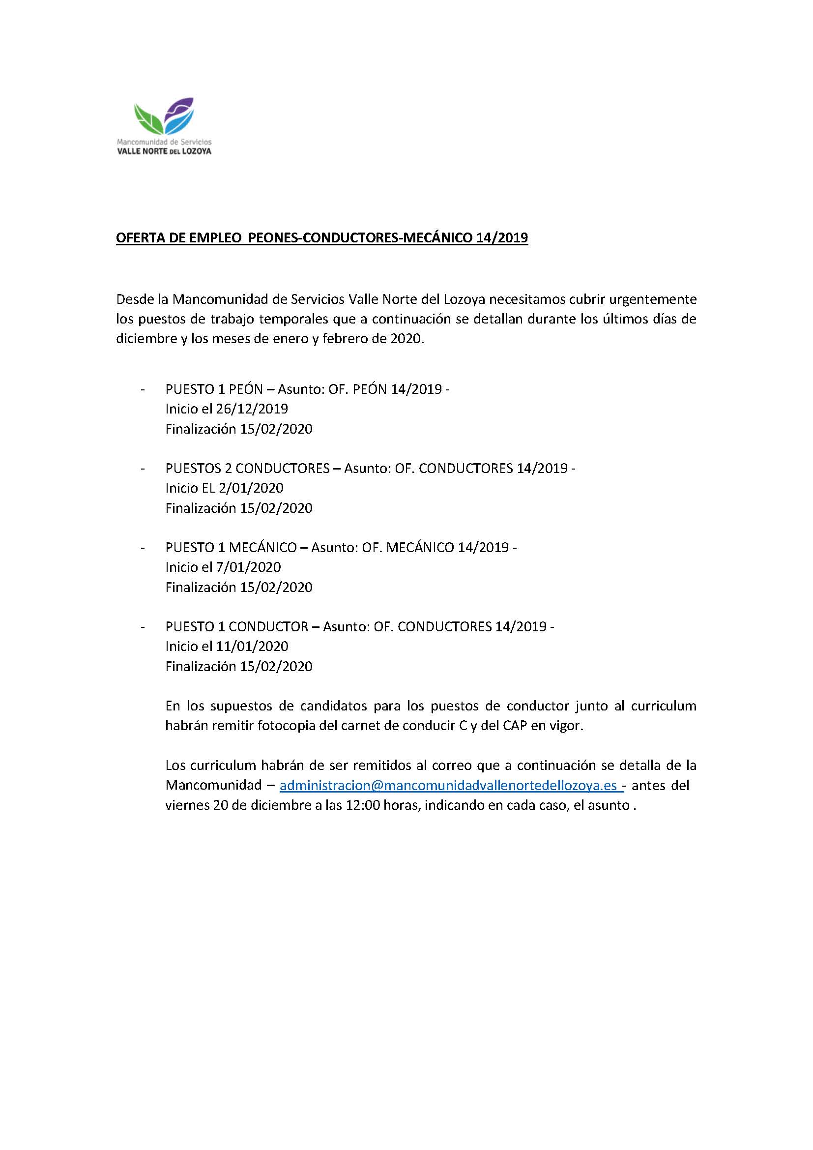 Tablón Municipal Tablón Municipal 16 diciembre 2019 Visto: 1060 La Mancomunidad de Servicios Valle Norte del Lozoya necesita cubrir urgentemente varios puestos de trabajo ++ tweet