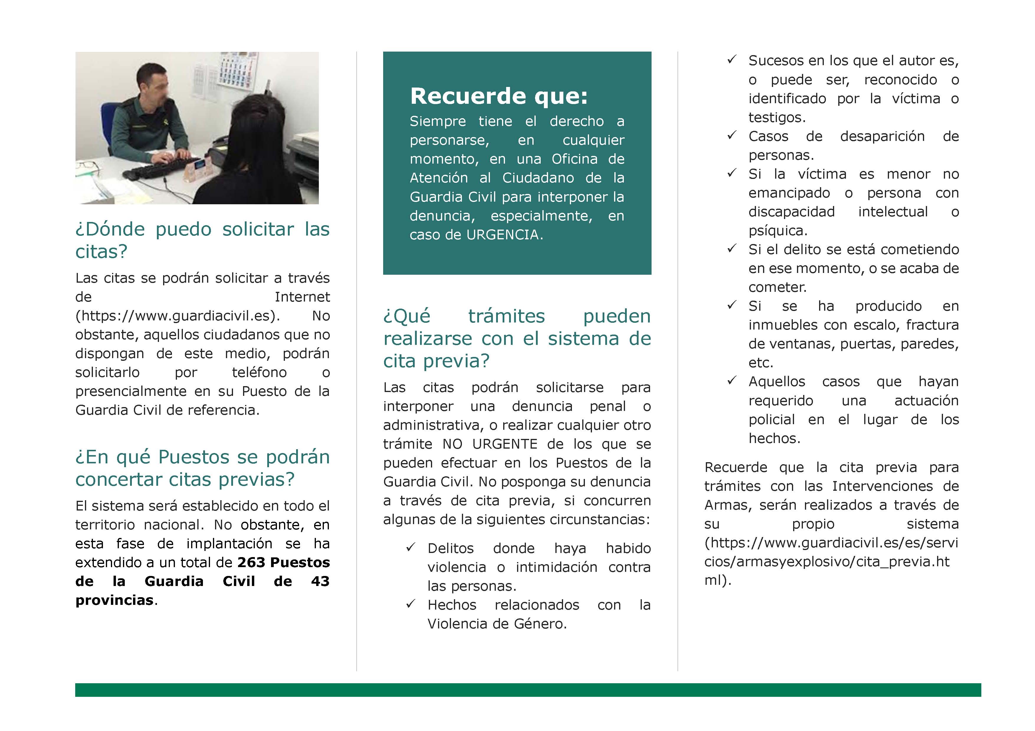 La cita previa es un servicio de administración electrónica que permite al ciudadano solicitar una cita para interponer una denuncia penal o administrativa o realizar cualquier otro trámite NO URGENTE en los Puestos de la Guardia Civil.