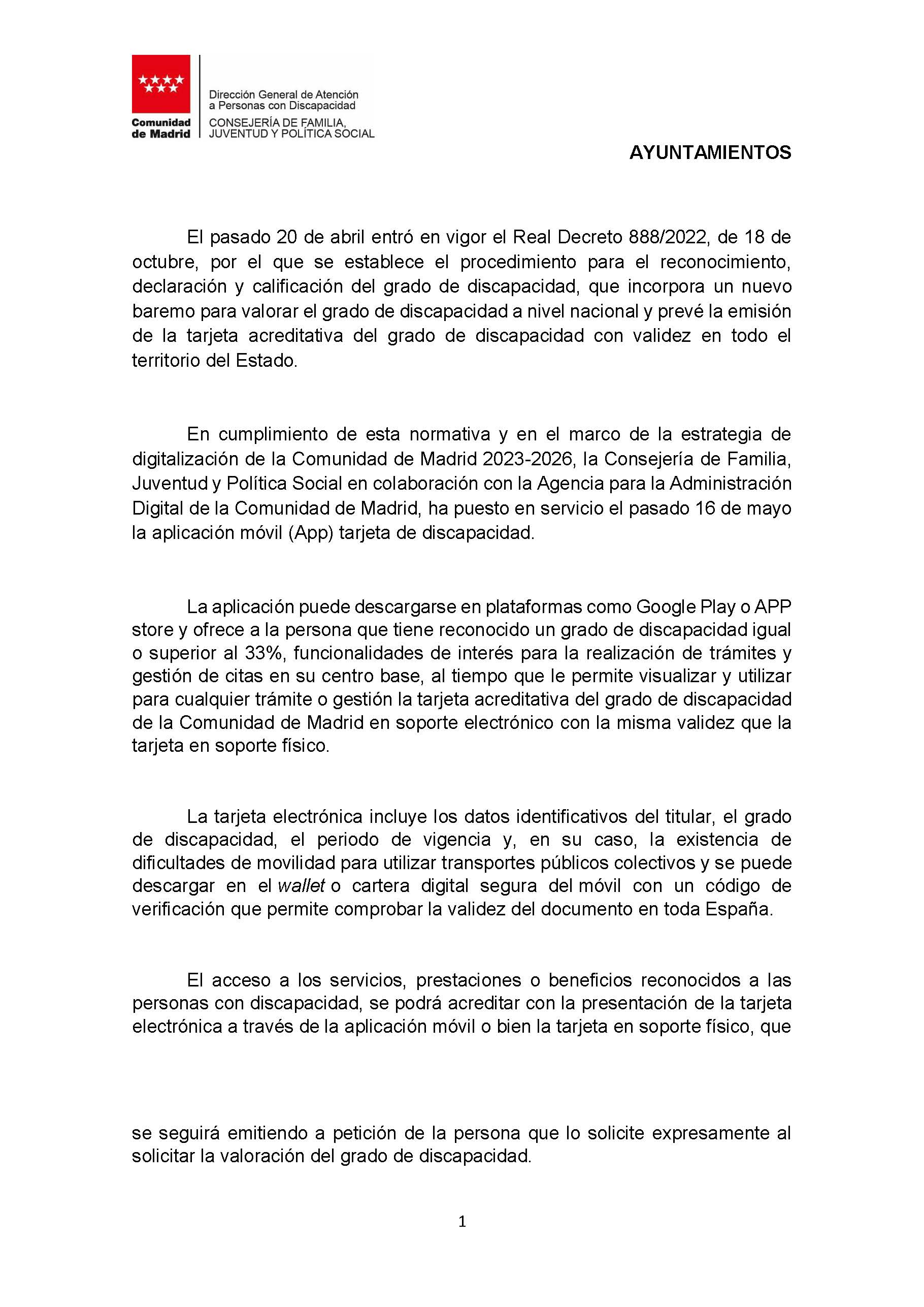 Tablón Municipal 12 junio 2023 Visto: 381 Tarjeta acreditativa del grado de discapacidad con validez en todo el territorio del Estado Leer más...